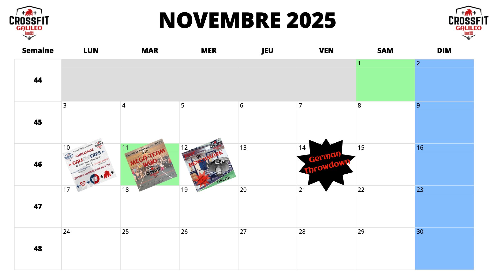Actualités & évènements Nos Actualités Novembre 2025 Les classiques : Challenge GaliGuières, Benchmark du mois, Mega Team WOD ! Nos Prochains évènements